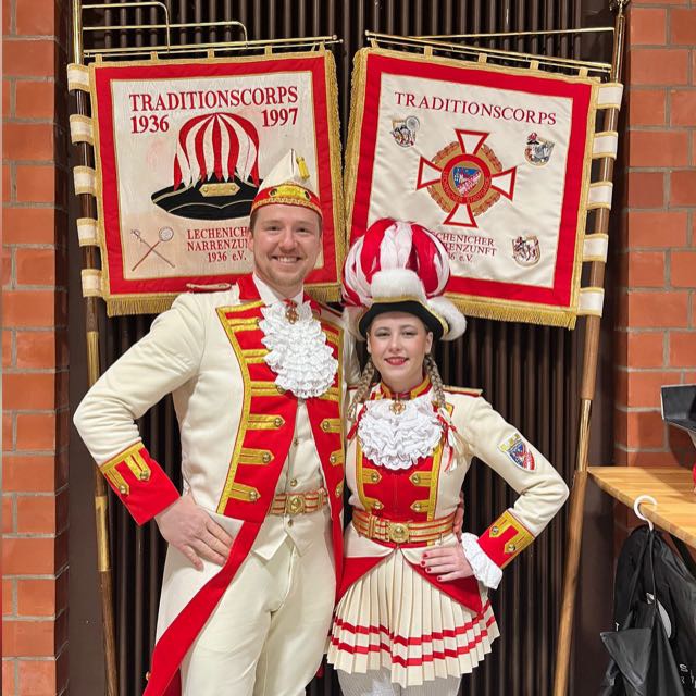 Seit der Session 2025-2026 bilden Greta Joachim und Richard Denneborg das Tanzpaar der Lechenicher Stadtgarde. Richard ist bereits seit 2021 Mitglied unserer Garde und beide sind fest in die Showtänze eingebunden. In der letzten Session, haben sie dem Publikum Ihren Mariechentanz präsentieren können.